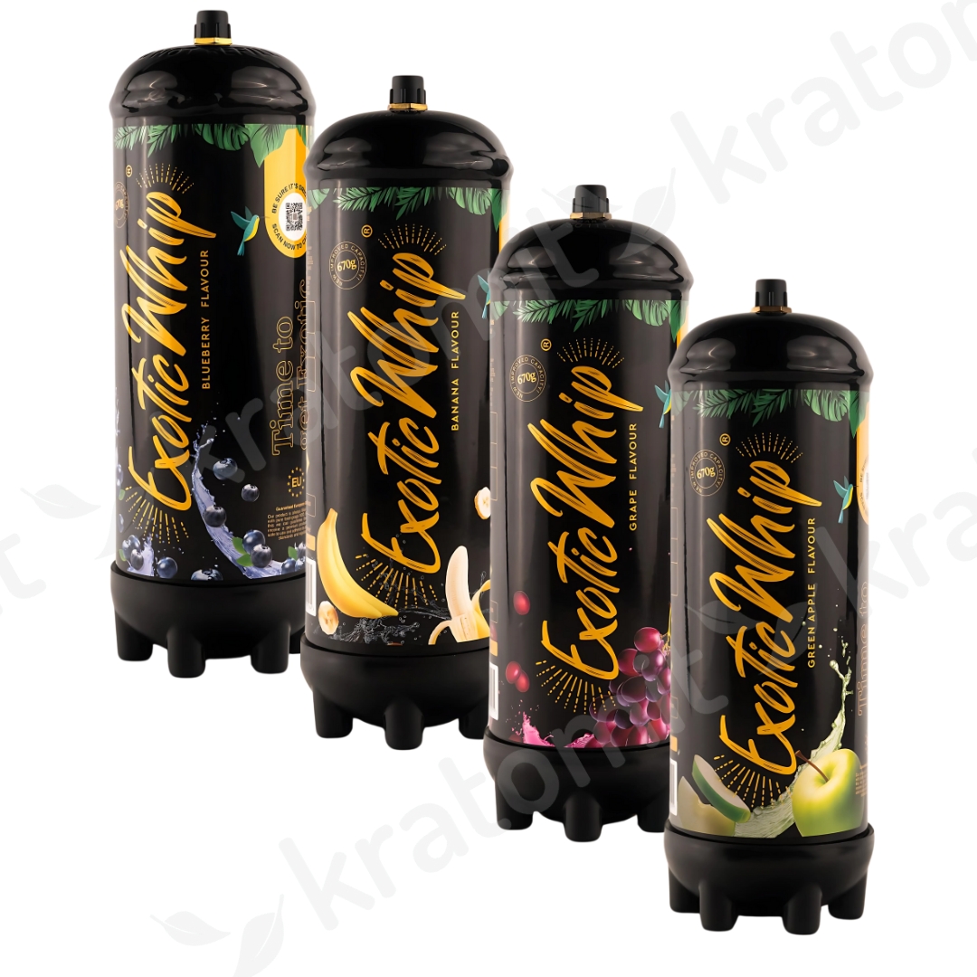 Die Exotic Whip ist der Marktführer unter den Paradiesgasbomben. In unserem Kratomit-Shop finden Sie sie in verschiedenen Geschmacksrichtungen, wie Exotic Whip Strawberry und Coconut, und jetzt sind wir die einzigen in Europa, die die Geschmacksrichtungen Banana, Green Apple, Grape und Blueberry anbieten.